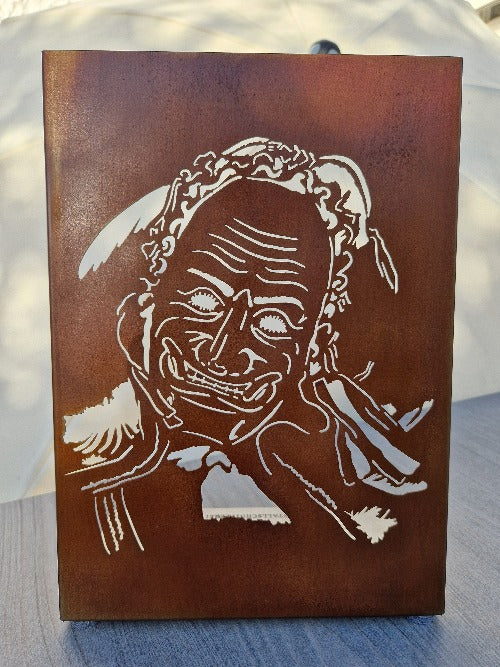 Motiv: Das kunstvoll in das Stahlblech eingearbeitete Rottweiler Federahannes-Motiv fängt die einzigartige Persönlichkeit dieser "Larve" ein. Jedes Detail wird durch die Rostpatina hervorgehoben, wodurch das Kunstwerk einen unvergleichlichen Charme erhält.