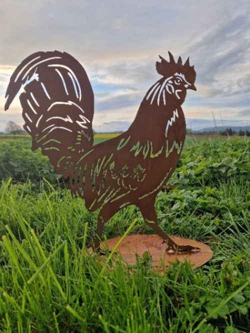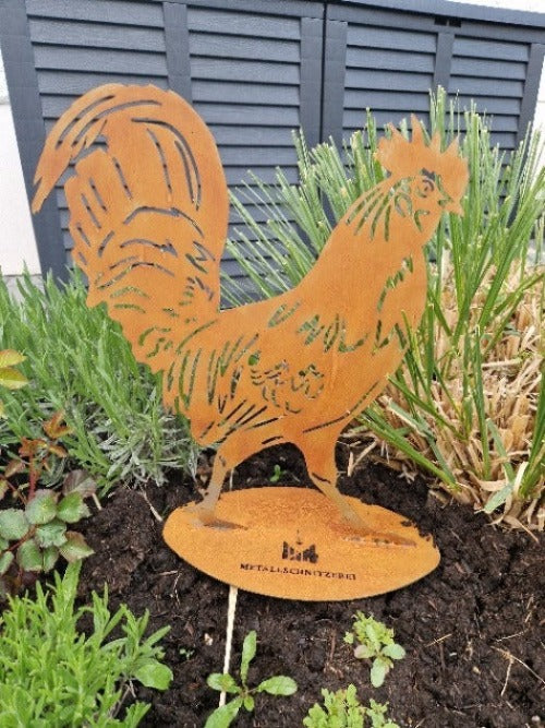 Entdecken Sie den rustikalen Charme unseres Stahl-Design-Blechs mit einem majestätischen Hahnmotiv für Ihren Garten. Der Hahn steht auf einem stabilen Fuß, der bei Bedarf beschwert werden kann, um Standfestigkeit zu gewährleisten. Hergestellt aus hochwertigem, verrostetem Stahl, ist dieses Kunstwerk wetterbeständig und langlebig. Verleihen Sie Ihrem Außenbereich mit diesem Blickfang eine charmante Note voller Persönlichkeit.